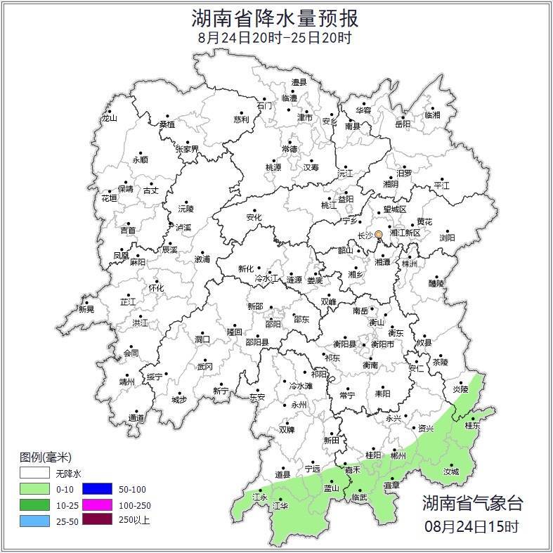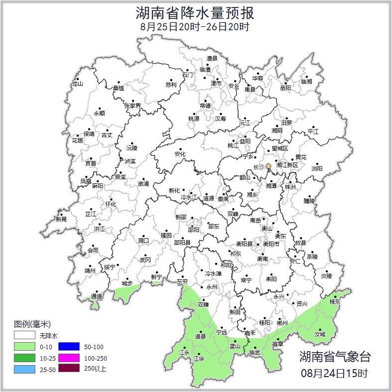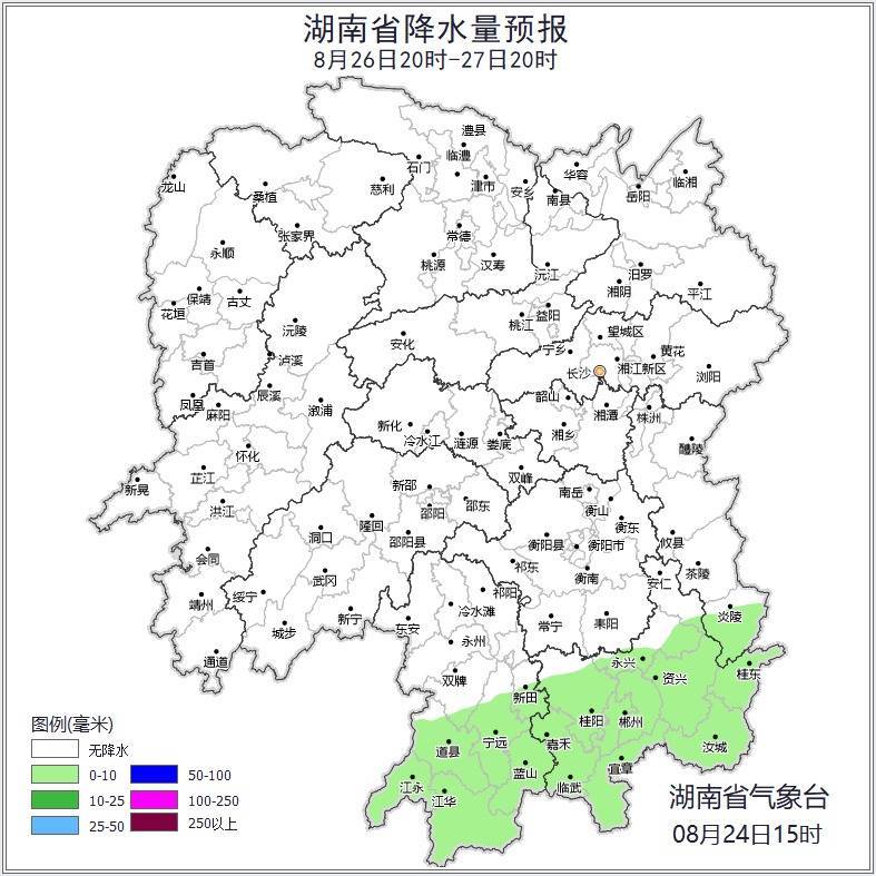 25日晚上至26日白天,晴天间多云,湘南局地有阵雨或雷阵雨;南风2~3级;最高气温湘西、湘南34~36℃,其他地区37~39℃,最低气温22~27℃。